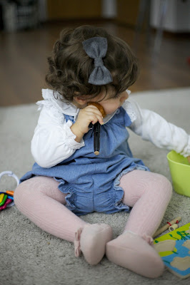 A "Mimi" ou "Minho", como se chama a ela própria, está numa fase muito engraçada. Repete tudo (TUDO mesmo!) o que dizemos e, por essa razão, o vocabulário que já sabe é bastante alargado. Adora esconder-se por trás dos cortinados ou móveis e espera que alguém pergunte por ela para depois aparecer e dizer "está aqui!". Gosta muito dos pais mas tem uma relação muito especial com o Pai. Adora desafios e brincadeiras/jogos novos. Neste momento, entretem-se muito a ver cartões com imagens, a fazer puzzles e jogos de encaixe e a folhear livros. É fácil entretê-la, felizmente. Outra das coisas que mais gosta é ir para a nossa casa de banho e mexer no nosso carrinho, especialmente nas prateleiras da Mãe que têm caixas de maquilhagem e copos com pincéis. Passamos o tempo todo a dizer "não mexe aí" mas acaba sempre por mexer mal nos apanha distraídos! =)